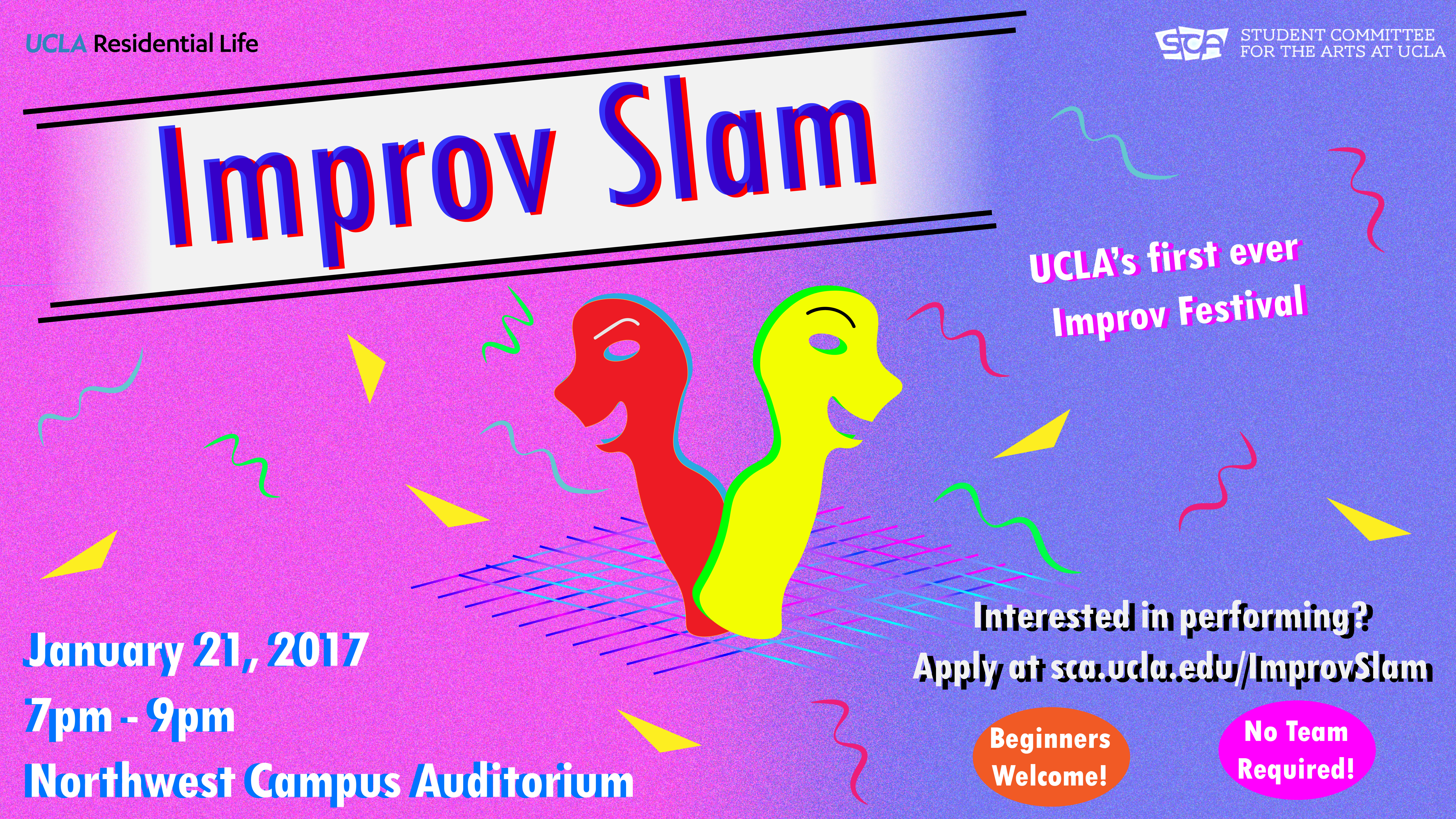 Improv Slam is UCLA’s first improv comedy festival brought to you by the Student Committee for the Arts and UCLA Residential Life! Sign up to perform, join a team, learn from professional coaches, and compete for great prizes – all in one day! Free and no experience necessary! Deadline to apply is Saturday January 14th.